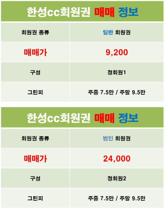 한성cc회원권 매물 안내(2020.06.15기준)