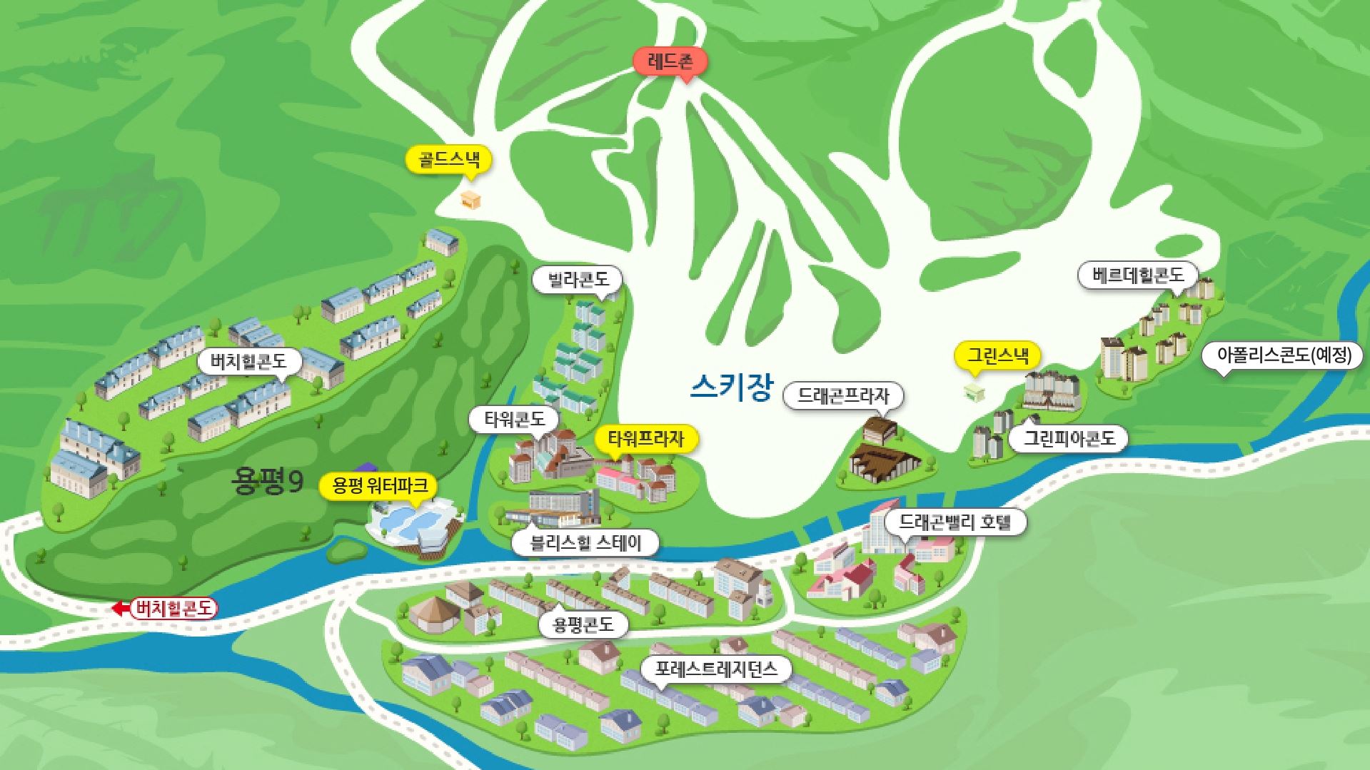 주요시설 : 워터파크, 곤돌라, 골프장, 스키장 등