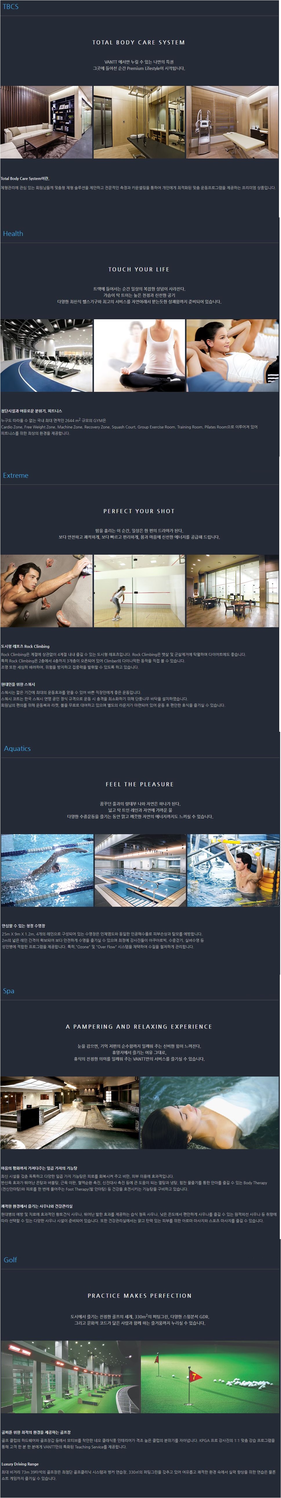 휘트니스 시설 : 체련장, 실내 수영장, 실내 암벽등반, 스파, 골프 연습장 등