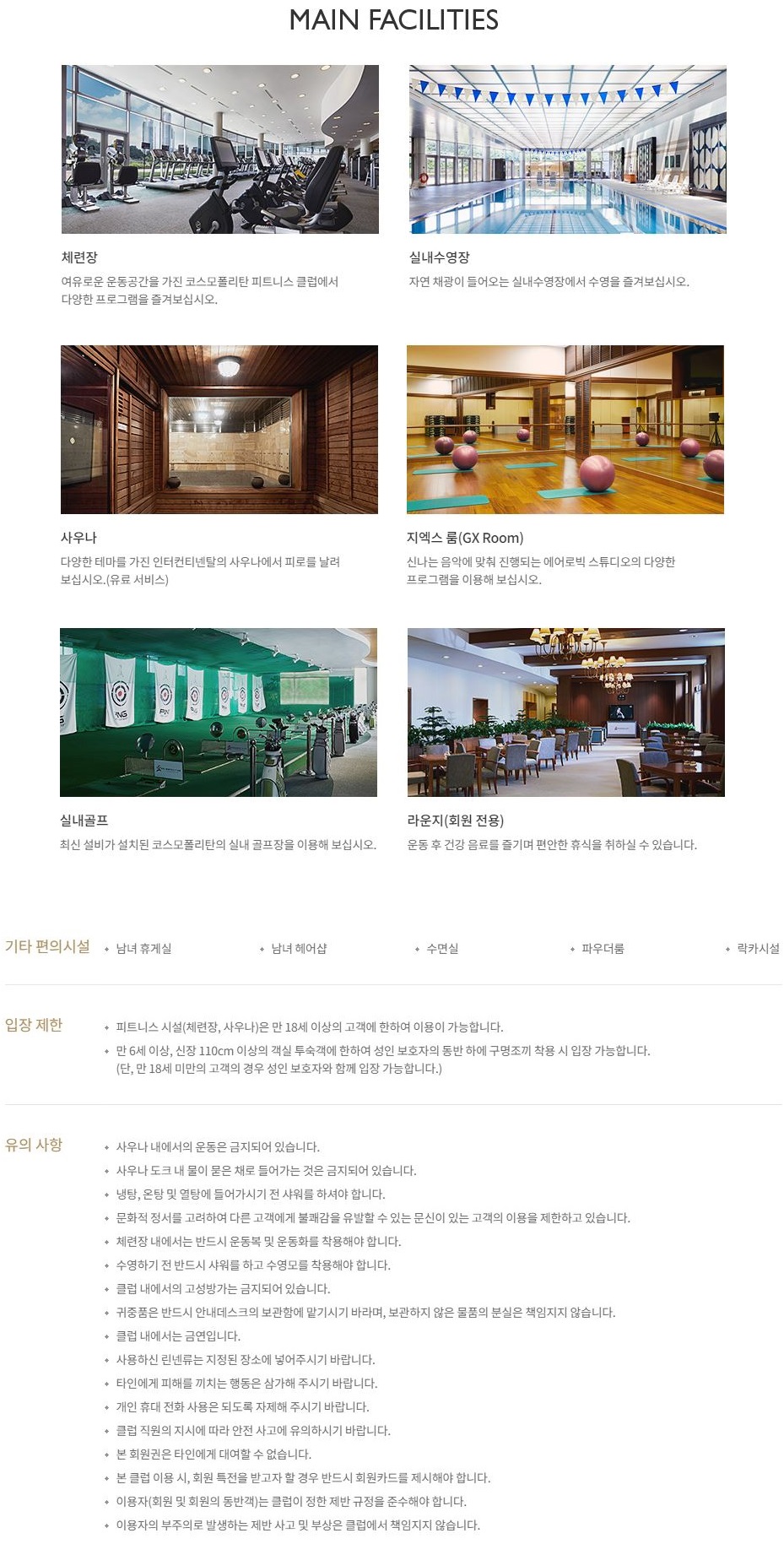 휘트니스 시설 : 체련장, 실내 수영장, 지엑스룸, 실내 골프장, 사우나 등