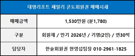 대명리조트회원권 패밀리 추천매물 매매시세 (2020.07.30.) 안내
