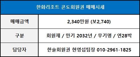 한화리조트회원권 만기반환형 추천매물 매매시세 (2020.08.06.) 안내