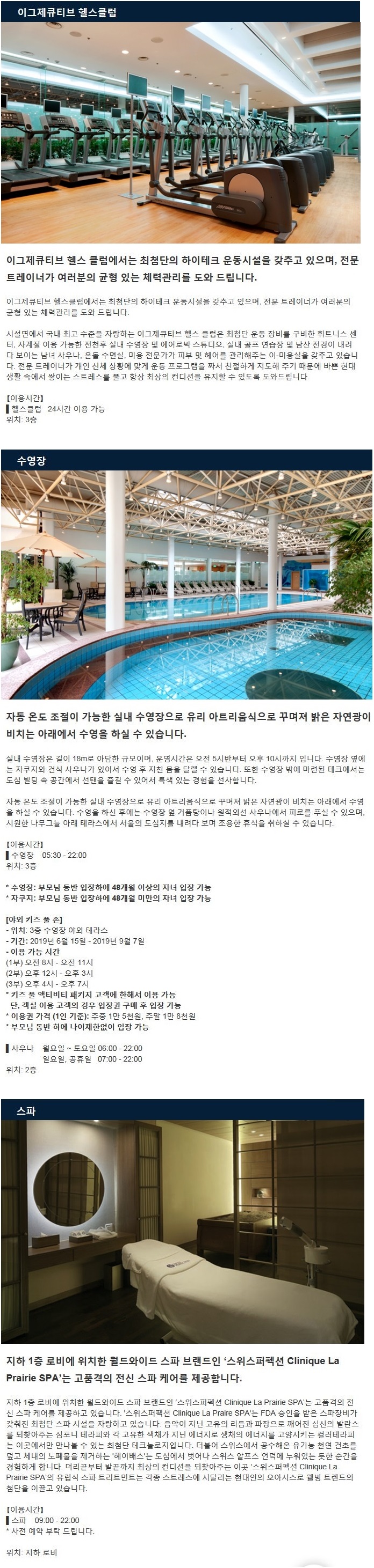 휘트니스 시설 : 체련장, 실내 수영장, 스파, 사우나 등