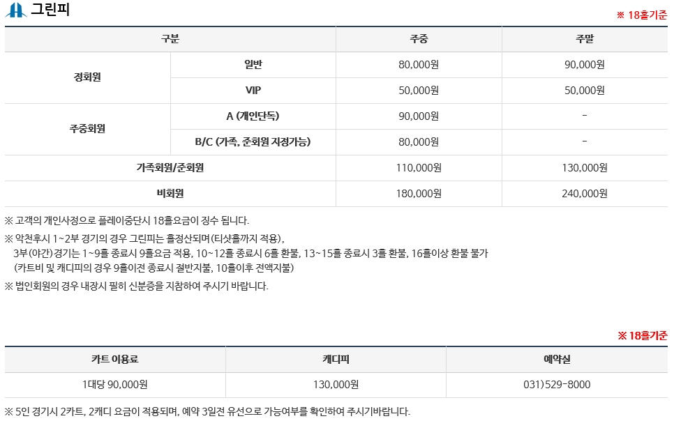 - 정회원 그린피 : 주중 8만원 / 주말 9만원