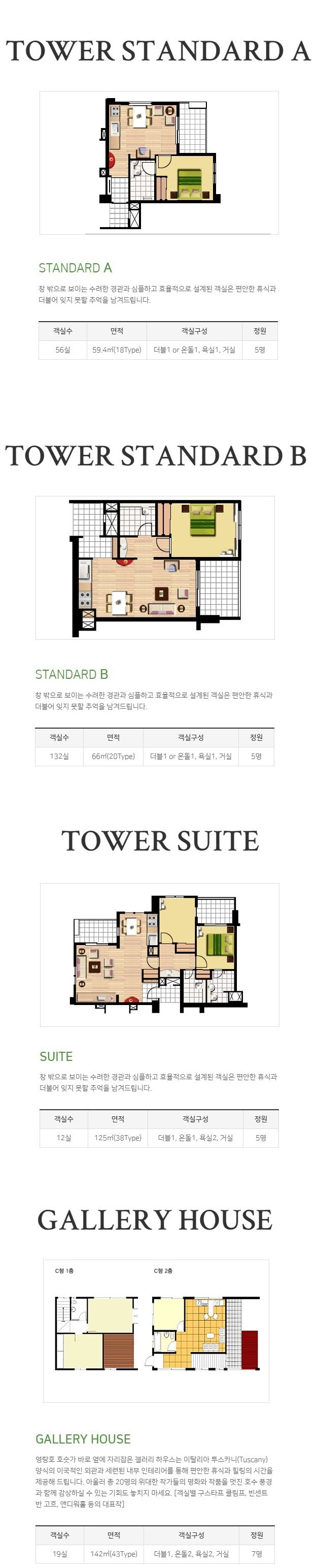 객실안내 : 스탠다드A(18평), 스탠다드B(20평), 타워스위트(38평), 갤러리하우스(42평)