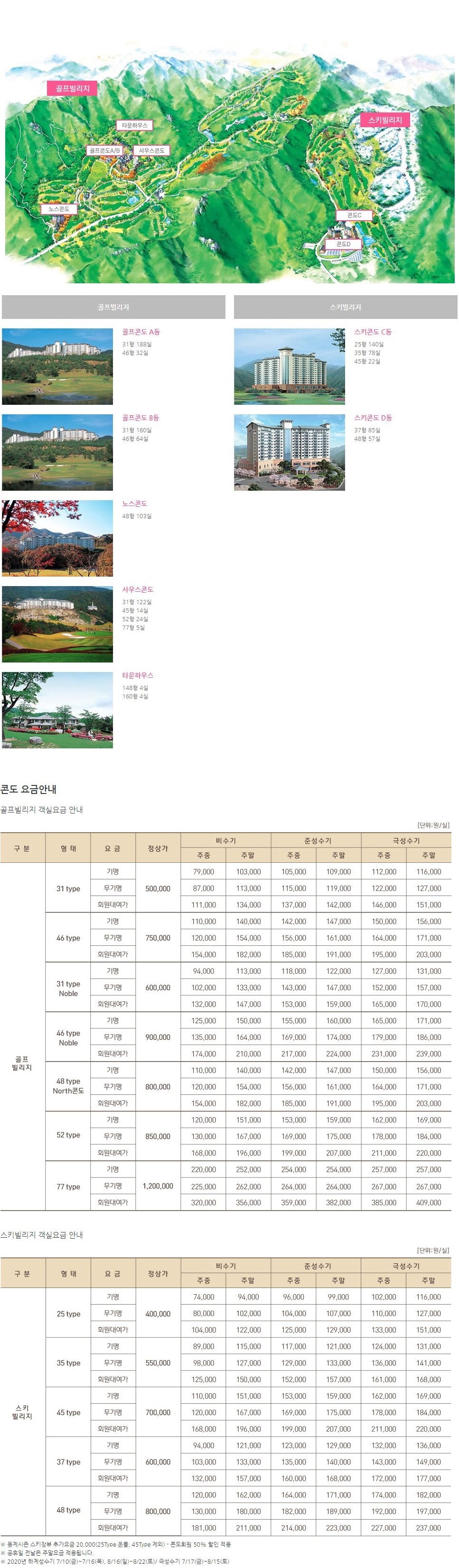 - 골프빌리지 : 골프콘도A동(31평/46평), 골프콘도B동(31평/46평), 노스콘도(48평), 사우스콘도(31평/45평/52평/77평),