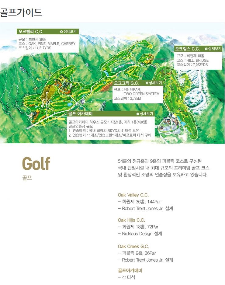부대시설 : 골프장, 스키장, 실내수영장, 헬스장, 놀이동산, 서바이벌장, 스크린골프 등
