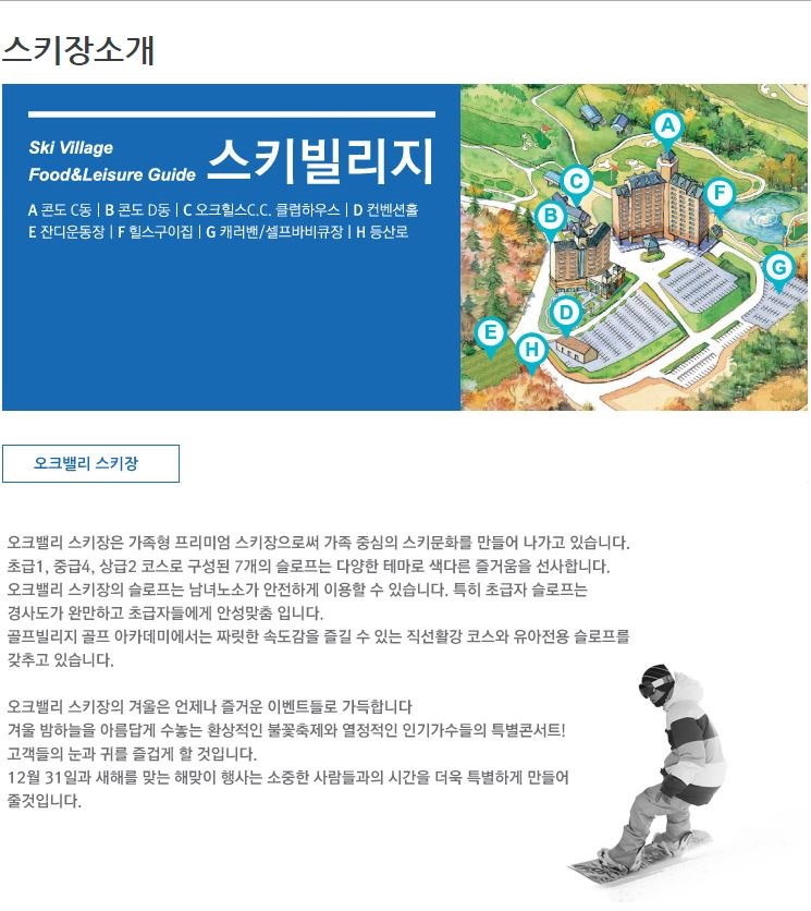 - 스키빌리지 : 스키콘도C동(25평/35평/45평), 스키콘도D동(37평/48평)