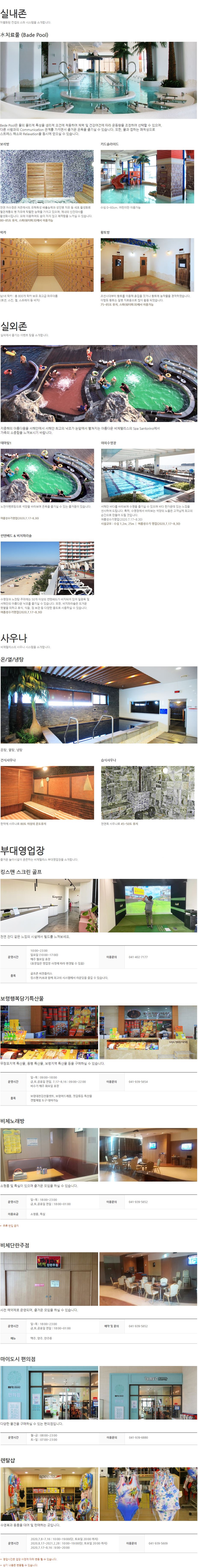 부대시설 : 실내외 워터파크, 사우나, 산토리노스파, 스크린골프장 등