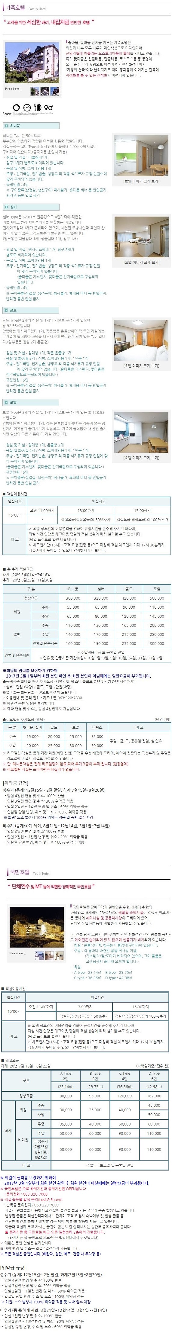 객실안내 : 허니문(15평), 실버(19평), 골드(28평), 로얄(39평)