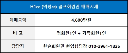 H1cc (에이치원/ 구.덕평cc) 골프회원권 추천매물 매매시세 (2020.10.20.) 안내