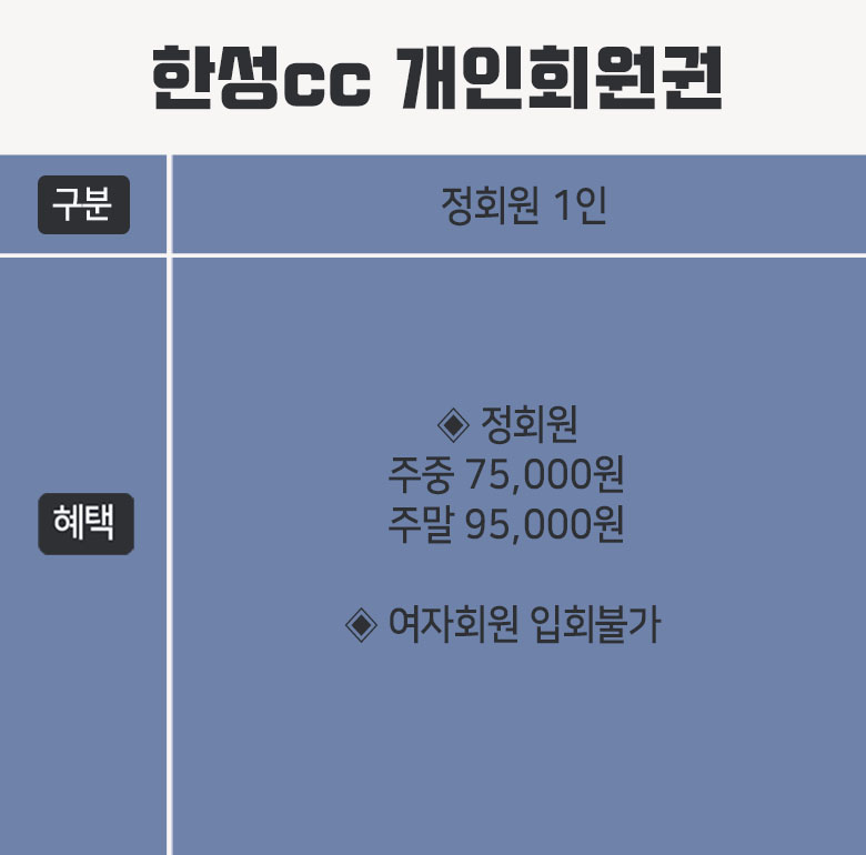 정회원 1인 입회로 구성되어 있습니다. 한성cc의 회원권의 경우