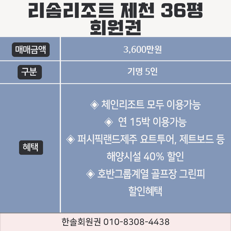 제천 리솜리조트의 회원권은 36평으로 기명 5인으로 구성되어 있습니다.