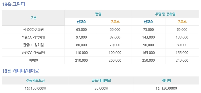 ▣ 한양cc 골프 그린피 및 이용요금 안내 ▣