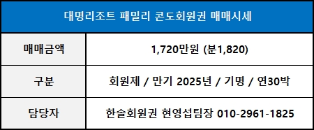 대명리조트 패밀리 콘도회원권 추천매물 매매시세 (2021.01.09.) 안내