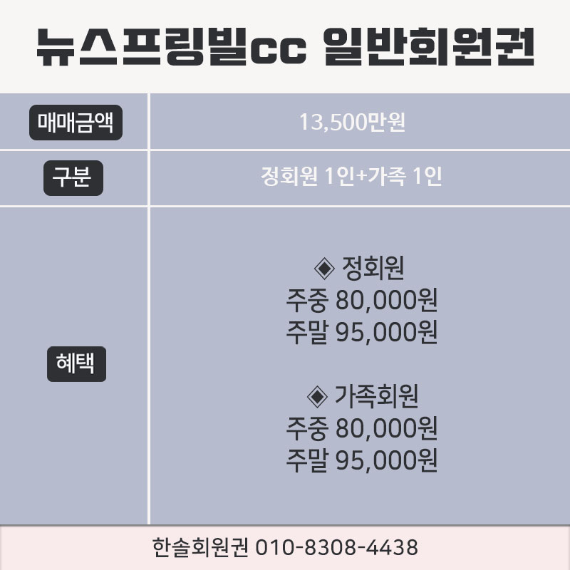 뉴스프링빌cc의 회원권은 일반회원권으로 정회원 1인과 가족회원 1인으로