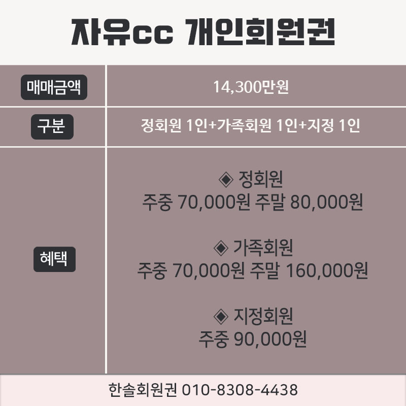 자유cc의 회원권은 개인회원권으로 정회원 1인과 가족회원 1인, 지정회원 1인으로