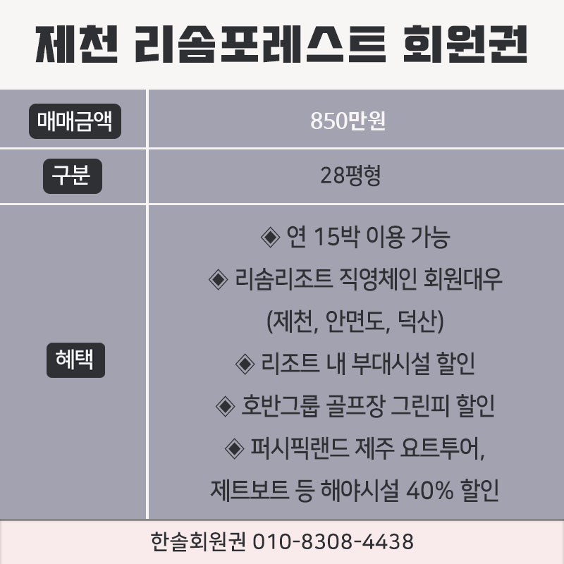 제천 리솜리조트의 회원권은 28평 회원권으로 연 15박 이용이