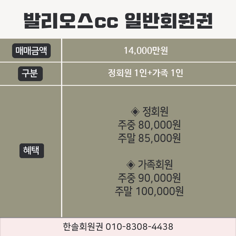 발리오스cc의 회원권은 일반회원권으로 정회원 1인과 가족회원 1인으로