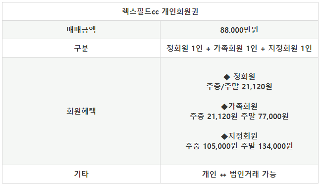 렉스필드cc의 회원권은 정회원 1인과 가족회원 1인, 지정회원 1인으로