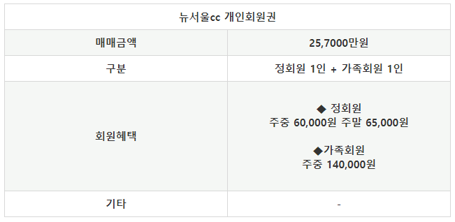 가족회원 1인으로 구성되어 있습니다. 뉴서울cc의 시세는 항상 변동되고