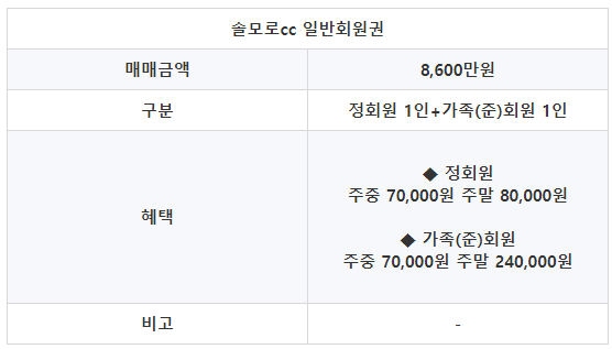 솔모로cc의 회원권은 일반회원권으로 정회원 1인과 가족(준)회원 1인으로