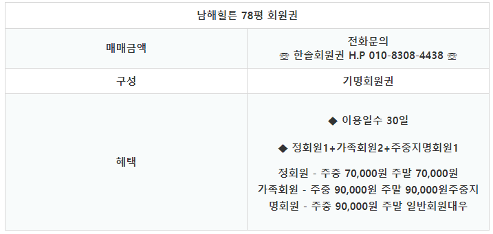 남해힐튼의 회원권은 78평 기명회원권으로 30일 이용이 가능합니다.