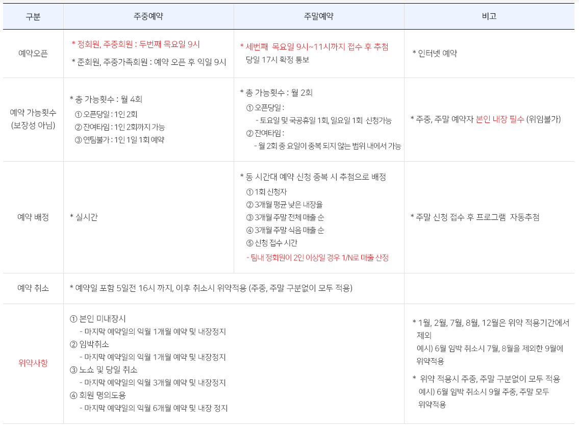 가족회원 1인으로 구성되어 있습니다. 주말 예약이 2회 가능하다는
