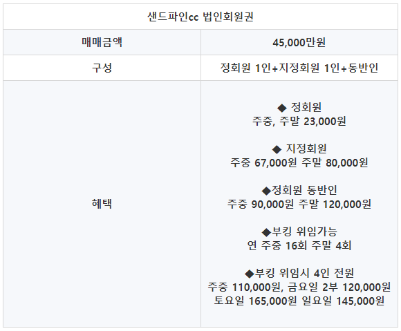 오늘 소개해드릴 샌드파인의 회원권은 법인회원권으로 정회원 1인,