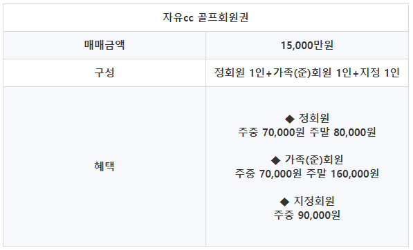자유cc의 회원권은 정회원 1인과 가족(준)회원 1인, 지정회원 1인으로