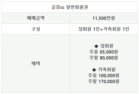 금강cc의 회원권은 일반회원권으로 정회원 1인과 가족회원 1인으로