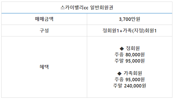 스카이밸리cc의 회원권은 일반회원권으로 정회원 1인과