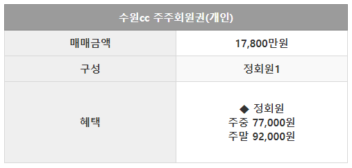 수원cc의 회원권은 정회원 1인으로 구성되어 있습니다.