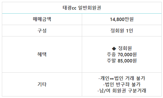 태광cc의 회원권은 일반회원권으로 정회원 1인 입회로