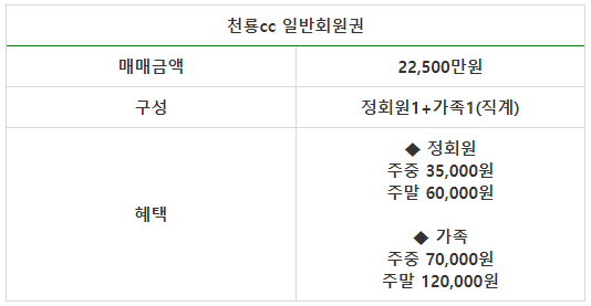 천룡cc의 회원권은 일반회원권으로 정회원 1인과