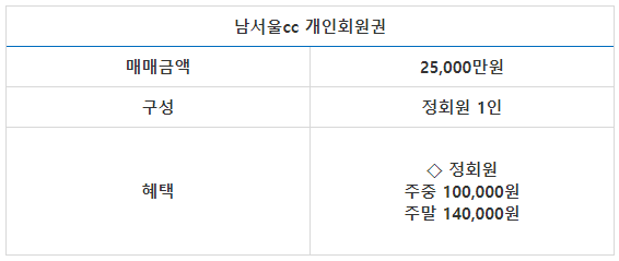 남서울cc의 회원권은 개인회원권으로 정회원 1인 입회로