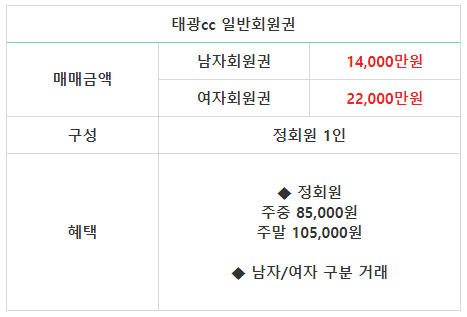 태광cc의 회원권은 남자와 여자가 구분되어 1인 입회만 가능하도록 한