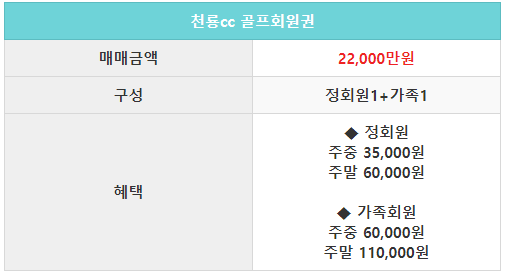 천룡cc의 회원권은 정회원 1인과 가족회원 1인으로