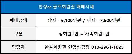 ☞ 안성cc 정회원권은 명의자의 성별에 따라 남/여 회원권으로 구분되며, 각각 매매금액의 차이가 있습니다.