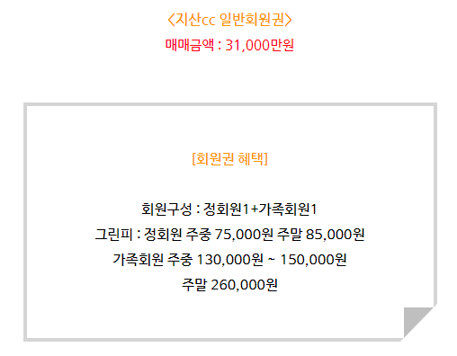 지산cc 회원권은 일반회원권으로 정회원 1인과 가족회원 1인으로