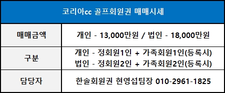 ☞ 코리아cc 회원권은 일반-개인/일반-법인/주주회원권으로 구분됩니다.