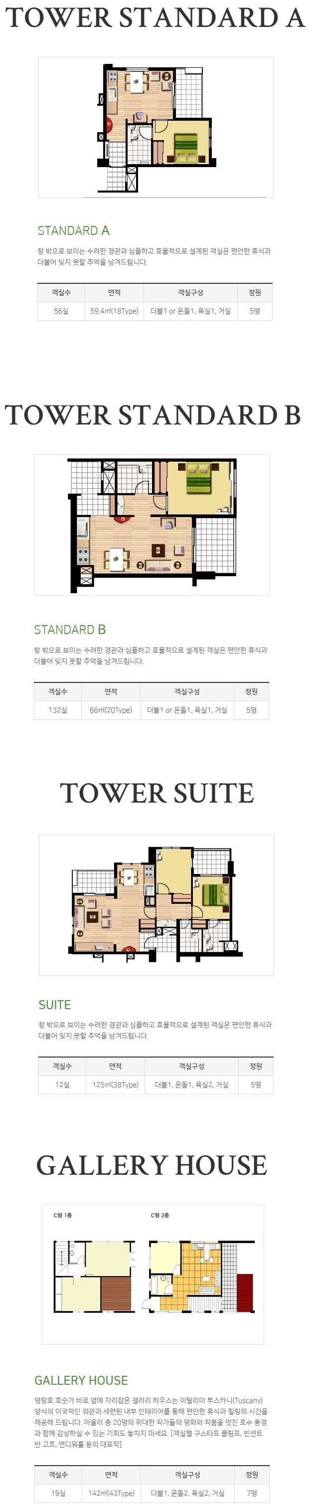객실안내 : 스탠다드A,B(18평-56실, 20평-132실), 타워스위트(38평-12실), 갤러리하우스(43평-19실)