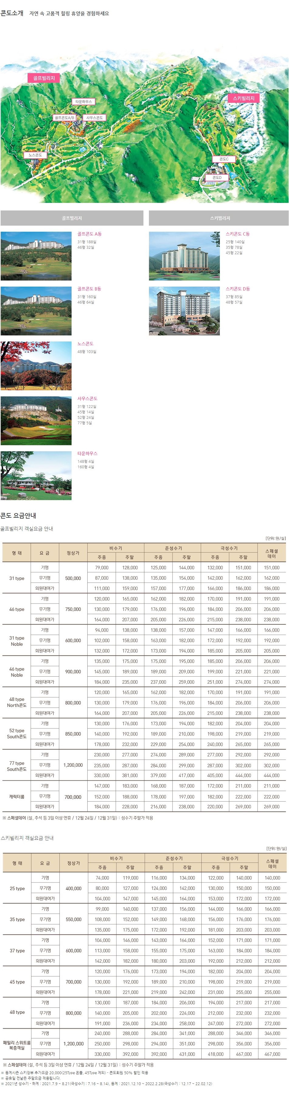 객실안내 : 골프콘도 A동(31평, 46평), 골프콘도 B동(31평, 46평), 노스콘도(48평), 사우스콘도(31평,45평,52평,77평)