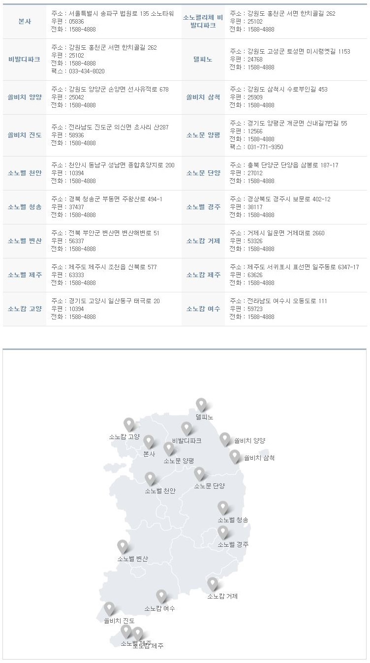 직영체인 : 비발디파크, 소노팰리체 비발디파크, 델피노, 쏠비치 양양, 쏠비치 삼척, 쏠비치 진도, 소노문 양평,