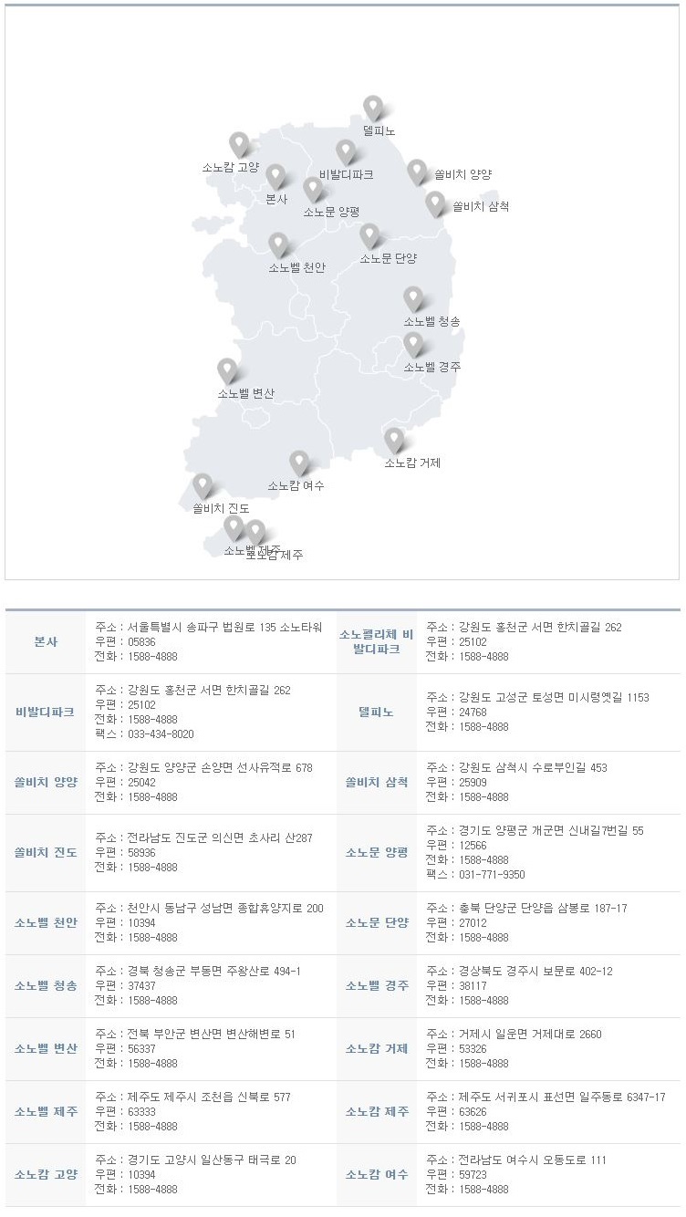 직영체인 : 비발디파크, 소노펠리체 비발디파크, 델피노, 쏠비치 양양, 쏠비치 삼척, 쏠비치 진도, 소노문 양평,