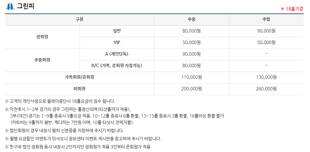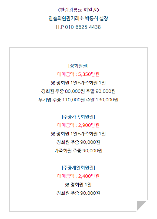 한림광릉cc 회원권은 정회원권과 주중가족,