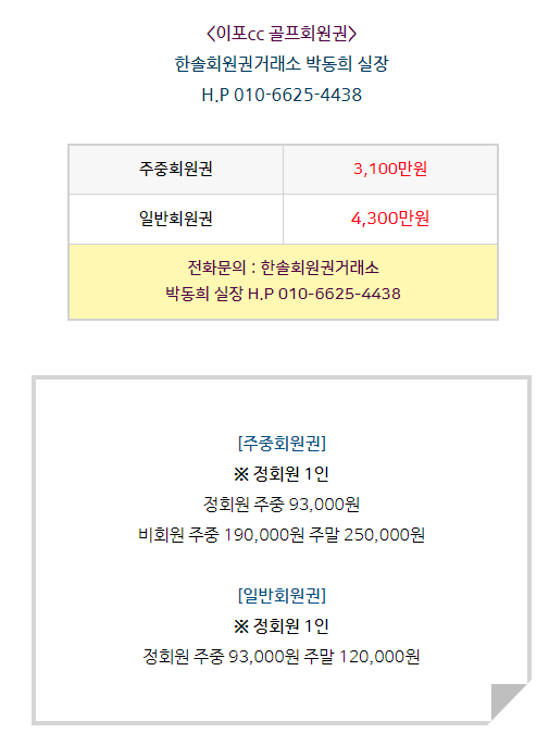 이포cc 회원권은 주중회원권과 일반회원권으로