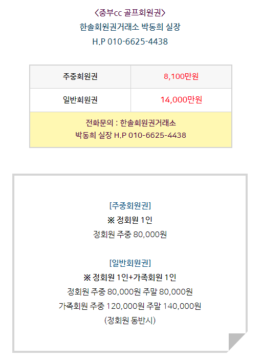 중부cc 회원권은 주중회원권과 일반회원권으로 구분되어