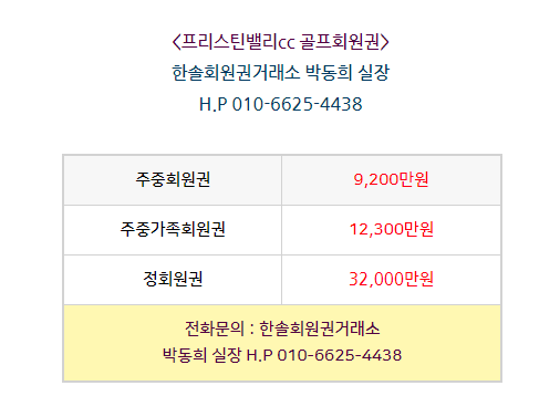 프리스틴밸리cc 회원권은 주중회원권과 주중가족회원권,