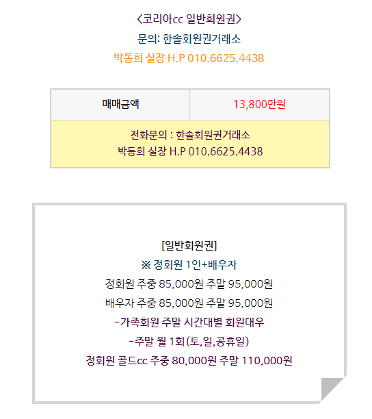 코리아cc 회원권은 일반회원권으로 정회원 1인과